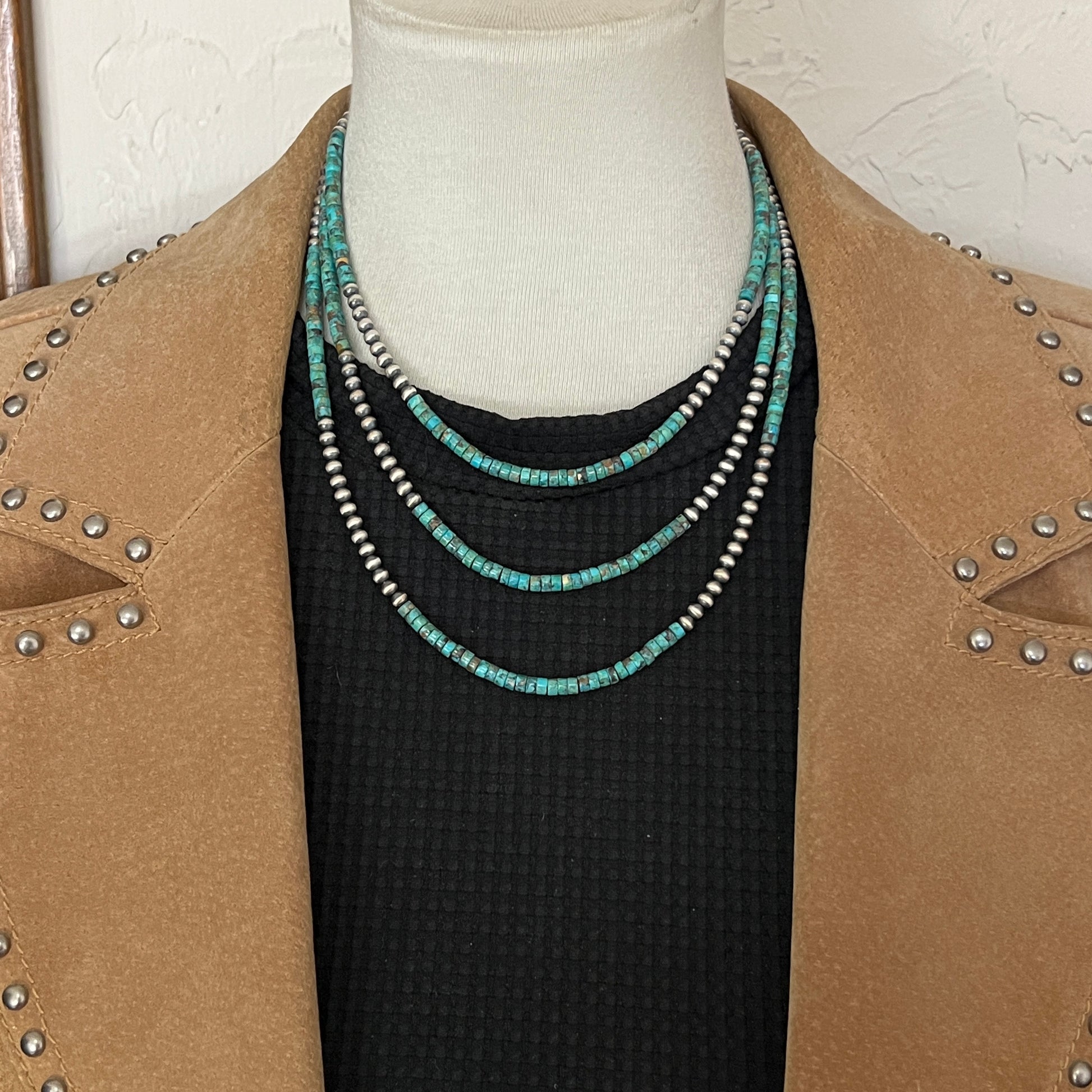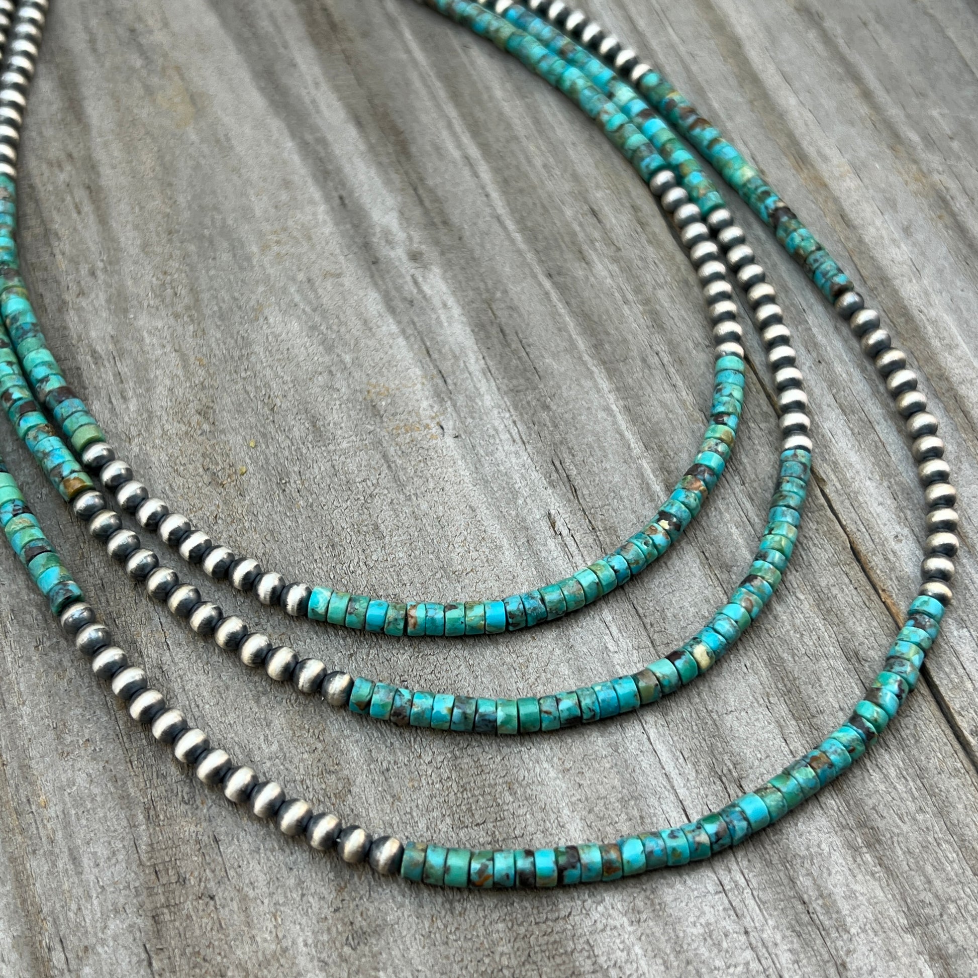 Real 925 sterling silver, 4mm Genuine Turquoise Heishi Necklace Oxidized Rustic Western Pearl Jewelry