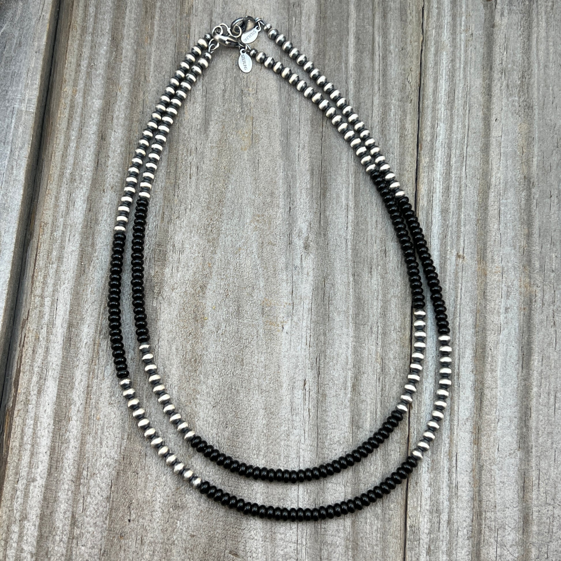 Discover one of our popular necklace designs: featuring oxidized sterling silver "pearl" beads. I first darken the silver adding rich depth. Then I polish the beads by hand, leaving the edges with that signature dark patina for a beautifully rustic, antique finish.